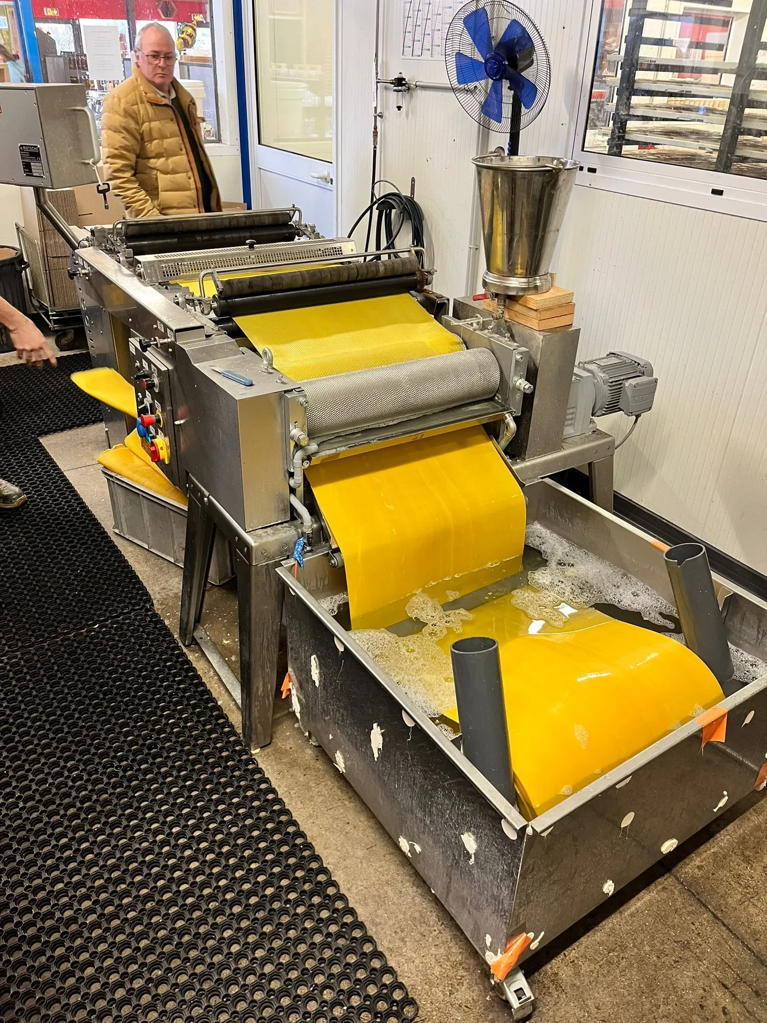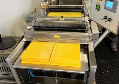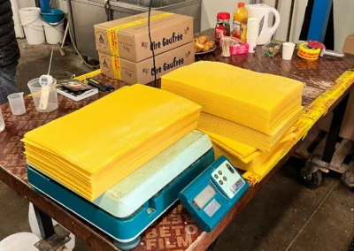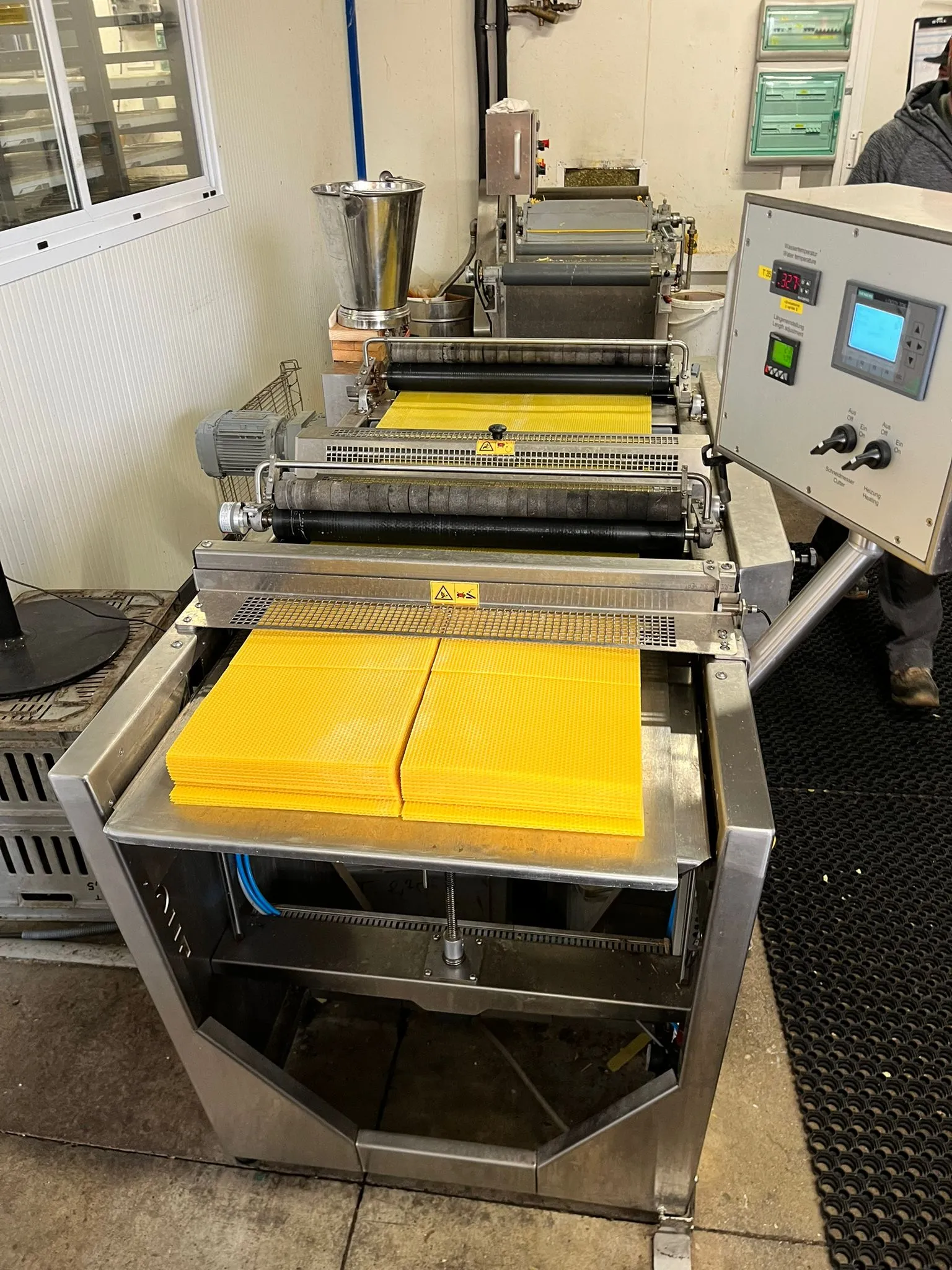 Au cœur de l’atelier, les visiteurs ont pu suivre pas à pas l’ensemble du processus de transformation de la cire brute en produits finis. De la réception de la cire d’opercule récupérée lors de l’extraction du miel jusqu’à l’obtention de feuilles gaufrées destinées aux apiculteurs, chaque étape a été détaillée avec pédagogie.